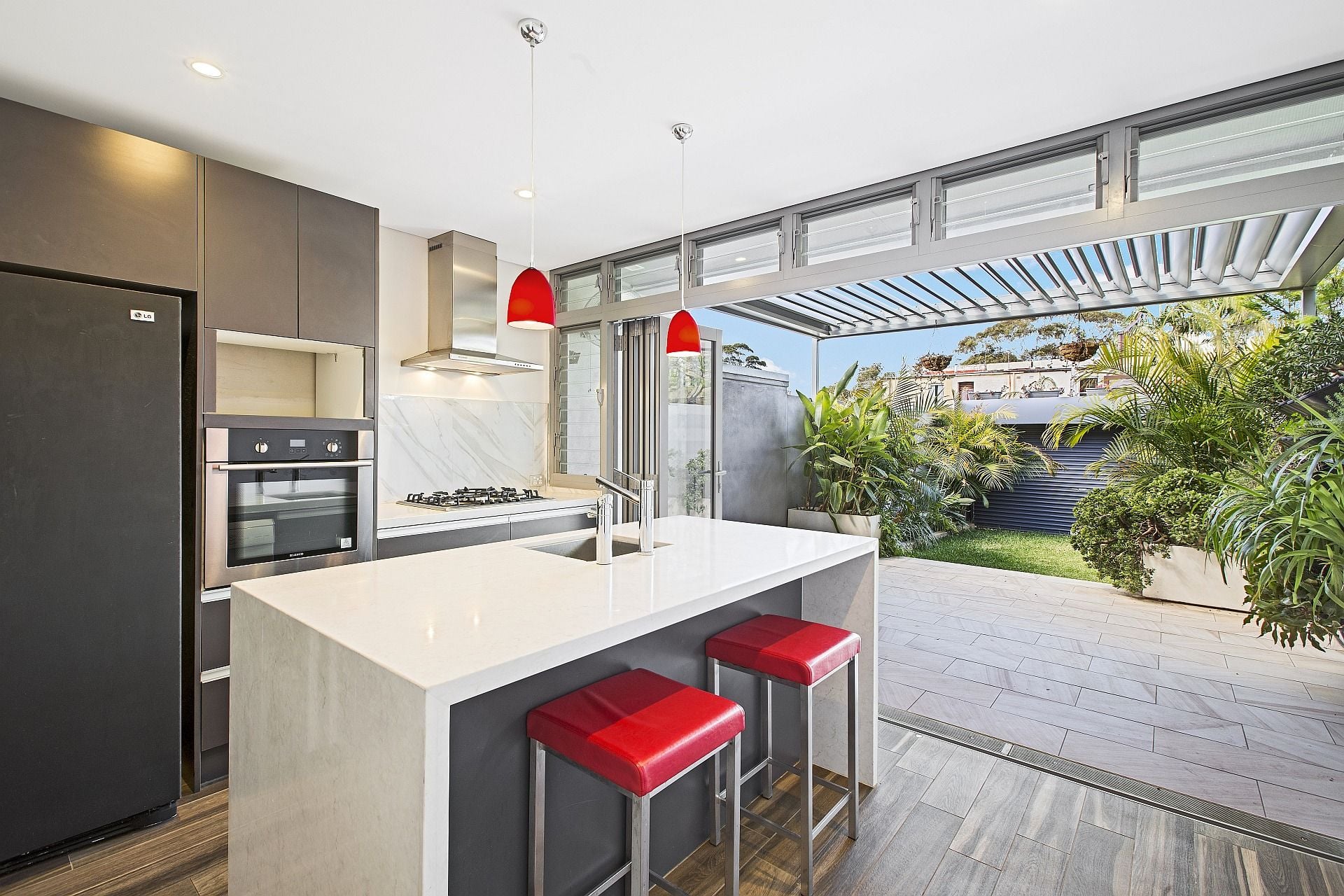 – Bi-folds open to a terrace with auto Vergola, verdant garden surrounds