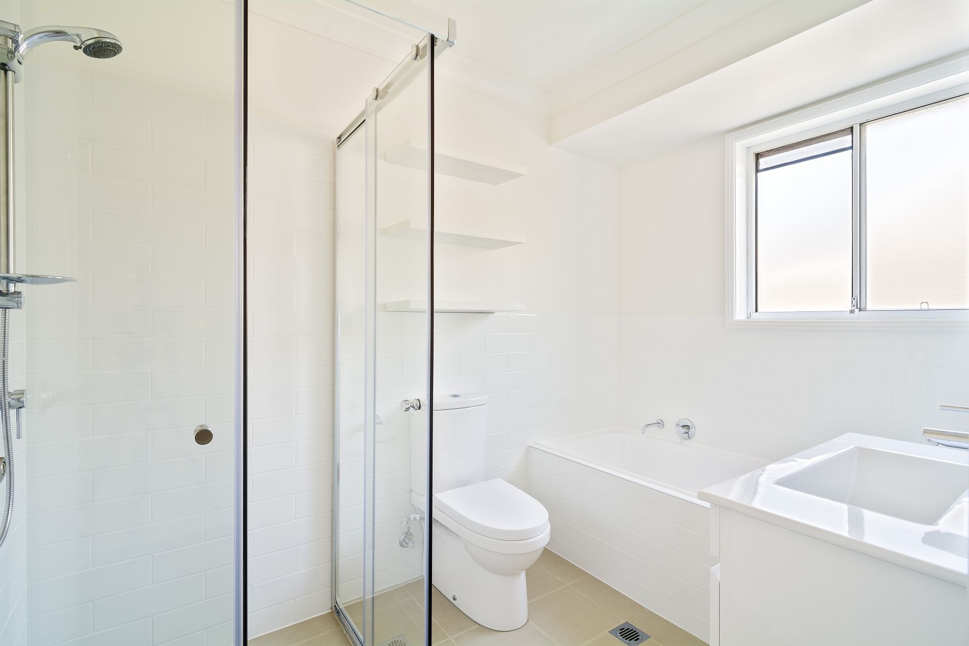 - Renovated bathroom, floor-to-ceiling tiles and separate bath
