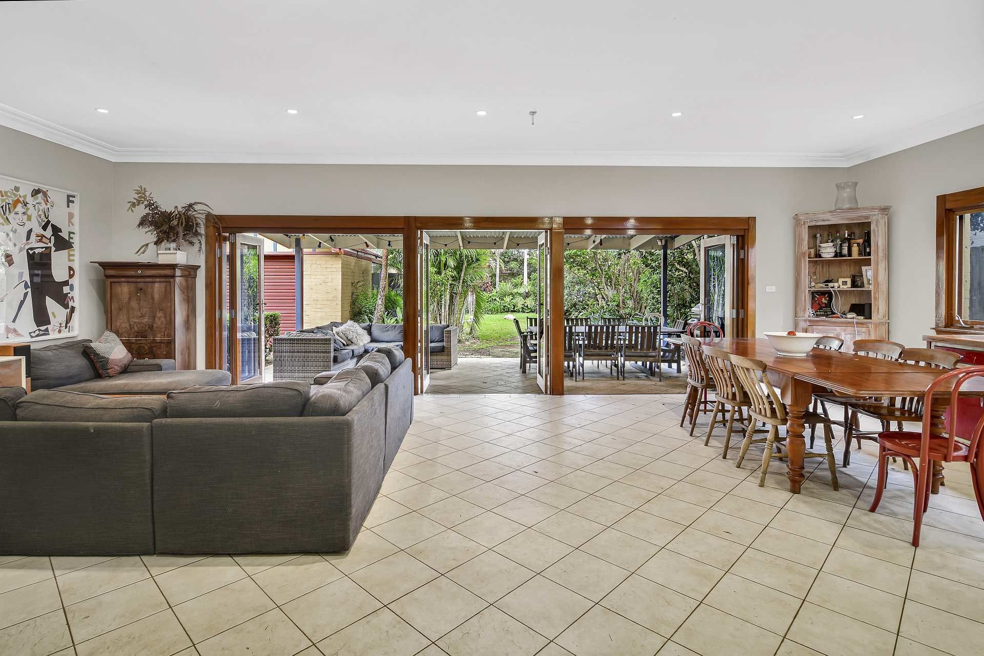 Open plan lounge and dining flows to an oversized yard